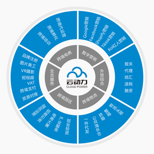 云动力致力于为外贸企业提供AMAZON跨境电商培训运营、跨境电商园区,FACEBOOK营销、GOOGLE营销、SHOPIFY建站,物流海外仓、外贸人才输出等多项精准整合营销服务。公司通过与世界领先的数字营销平台GOOGLE、FACEBOOK、LinkedIn和跨境电商平台AMAZON、EBAY、SHOPEE等紧密合作,不断创新,采用科学大数据分析手段,整合国内外互联网多个推广渠道,让客户营销效果达到极致,持续不断的提高客户海外市场占有率!